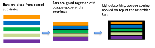 Iridian’s multi-zone filter butcher-block assemblies address needs in multi-spectral imaging applications requiring many bands, complex filter coatings or with constraints on cost. In this process coatings are deposited on separate substrates that are then attached together using robust assembly methods.